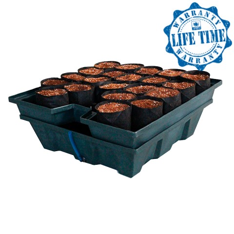 Dyrk i potter med coco, legakugler eller jord. Nemt, praktisk og effektivt system. Vil du dyrke hydroponiske urter og grøntsager derhjemme, på arbejde eller på skolen, og samtidigt holde det simpelt? Ebb & Grow betyder, at du kan bruge enhver potte, du kan lide, og flytte planterne rundt efter eget ønske, der er ingen fast plads! Urter i fronten og tomater og chilier bagerst? Intet problem. Alle GHE’s hydroponics-systemer er fleksible, men Ebb & Grow er virkelig det mest tilpasningsdygtige system, de nogensinde har lavet, og uden risiko for lækage eller overløb, let demontering og rengøring, det kan bruges overalt, hvor pladsen er til rådighed. GHE Ebb & Grow er et “tømme og oversvømmelse” design: en simpel timer (medfølger ikke) kører en pumpe med mellemrum for at bringe næringsopløsning op til vækstbordet, hvor det skyller brugt luft væk fra rødderne på dine planter, vander og fodrer dem, trækker derefter frisk luft ind, når vandet drænes ned til reservoiret. Den tåler vægten, tanken understøtter midten af bordet så man kan roligt fylde godt op. Systemet kan rumme op til toogtredive 15 cm plastikpotter, toogtyve 1 gallon (3,75L) stofpotter eller så mange større potter, som du kan få plads på dens 86×86 cm firkantede overflade, og med en højde på bare 38 cm er dette system til at bruge alle steder!