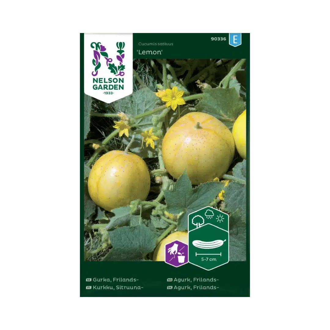 Drueagurk ‘Lemon’ fra Nelson Garden er en særdeles givende og lettilgængelig agurk til friland. Planten sætter talrige runde agurker – bind den op eller lad den slynge sig på jorden. Frugterne bør høstes, når de får en fuld gul farve; lader du dem blive for store, forringes smagen, og planten kan stoppe med at sætte ny frugt. Såning kan ske direkte i maj–juni, når jordtemperaturen er over +15 °C, eller som forkultur 3–4 uger før udplantning. Sådybden er 2 cm, planteafstand 15 cm, og rækkeafstand 125 cm. Ved korrekt dyrkning – med varme, sol og tilstrækkelig plads – vil ‘Lemon’ give en solid høst fra august til september. Den er oplagt, hvis du vil have en pålidelig, nem og produktiv agurk i køkkenhaven.