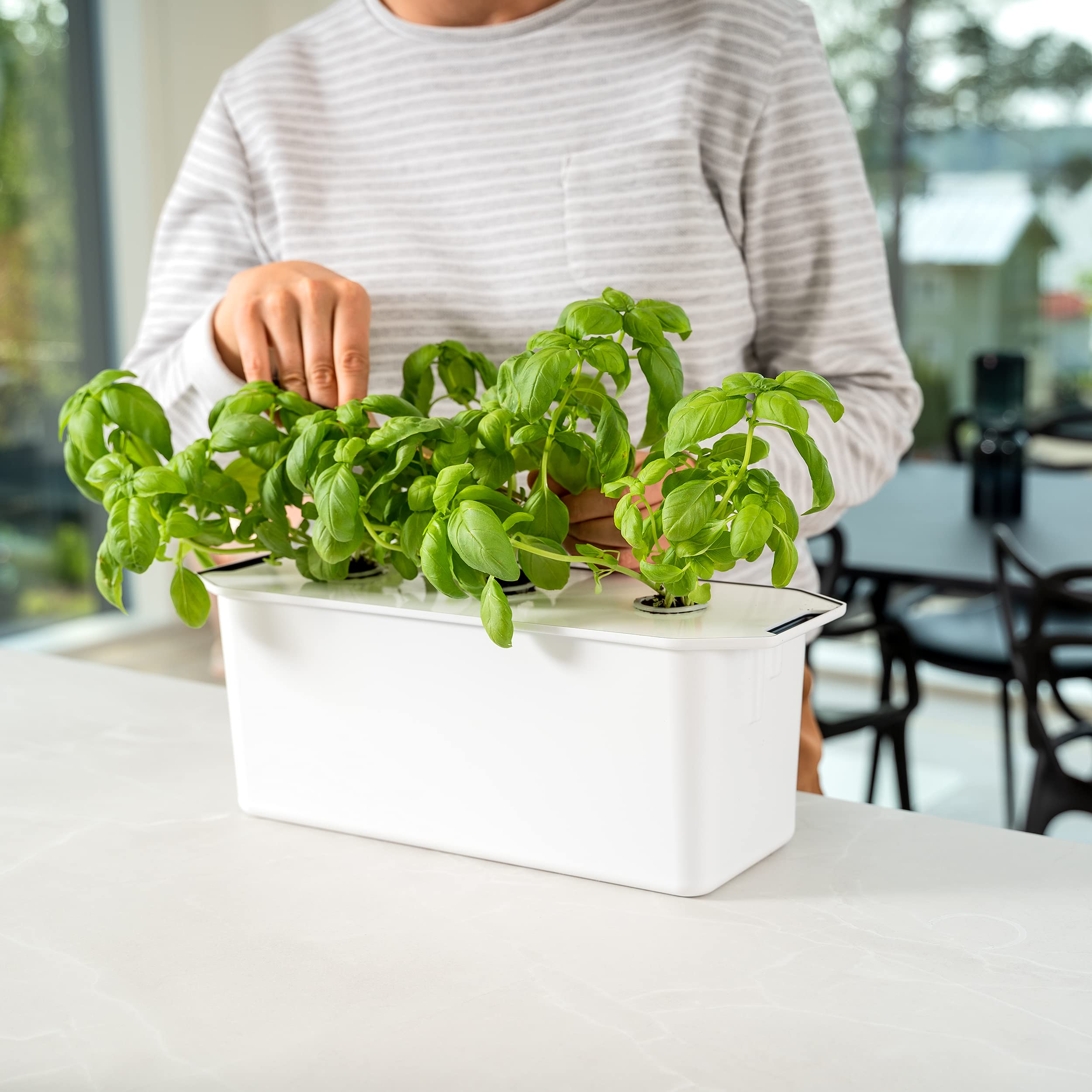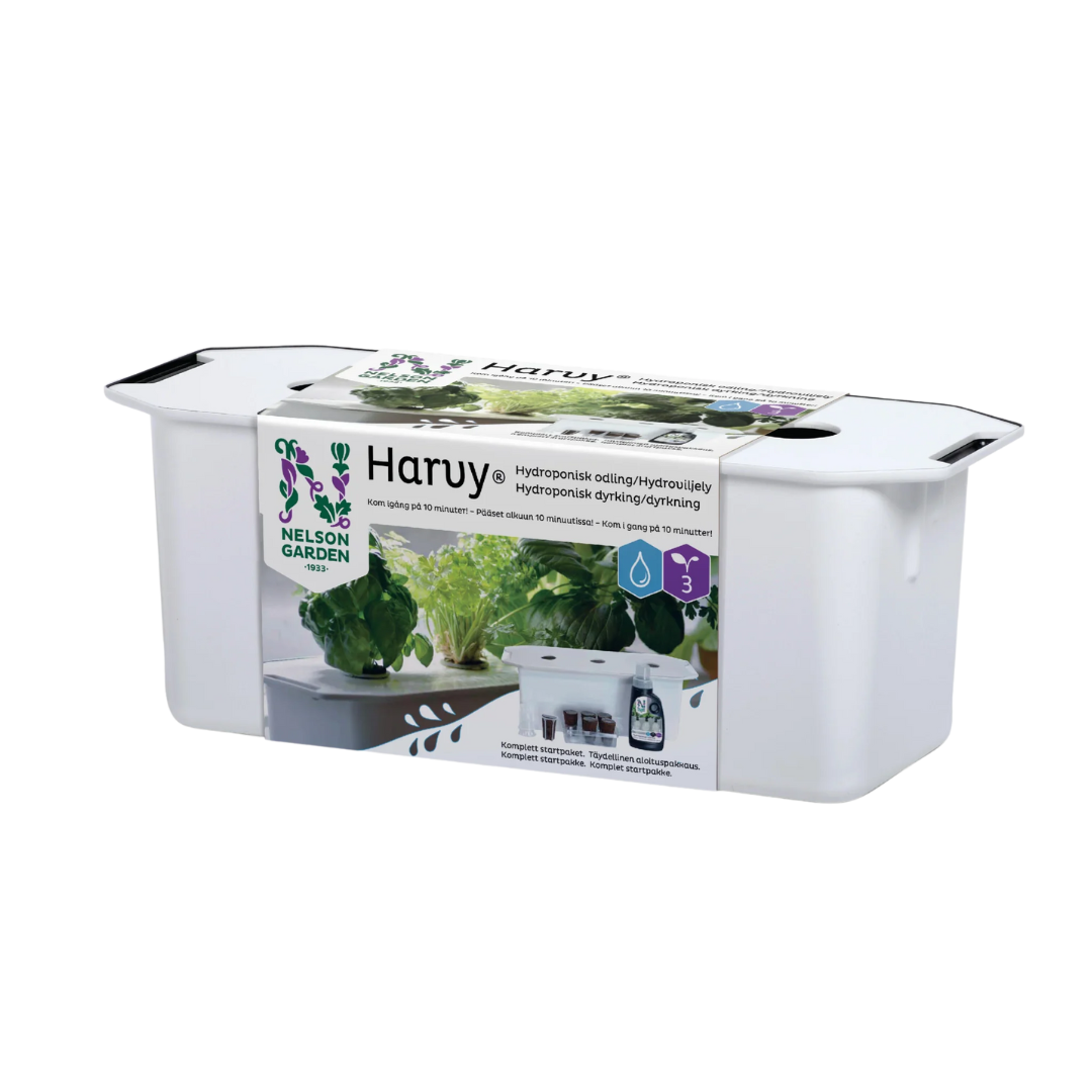 I Harvy kan du f.eks. dyrke nyttige grønne blade, urter og blomster i vand, uden jord og uden et krav til forkundskaber. Dyrkningskassen har et tidløst design, som passer lige så godt i en lille lejlighed i storbyen som i et stort hus på landet. Den kan placeres indendørs eller udendørs, og den gør dyrkningen nemmere. Men det bedste er – du kommer i gang på 10 minutter, og dyrkningen passer sig selv for det meste.